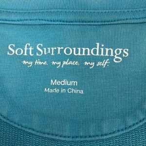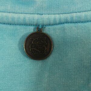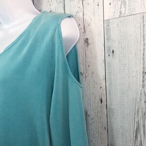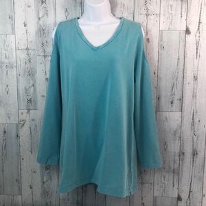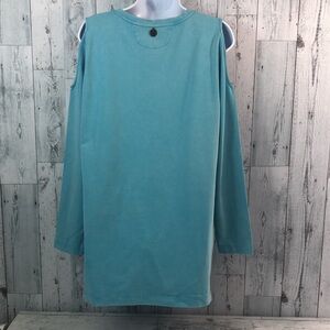 Slightly marbled aqua color, v-neck, sits at hips, cold shoulder, small spot at neck and hem see pictures,colors may vary due to lighting, good used condition, Sz: M