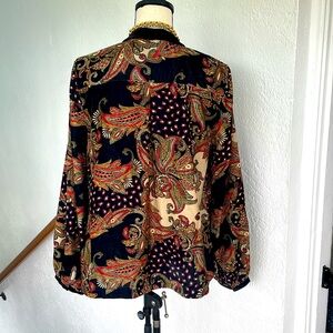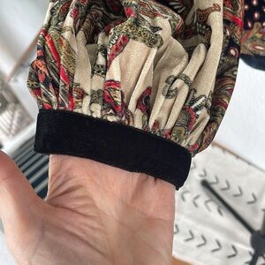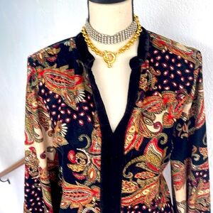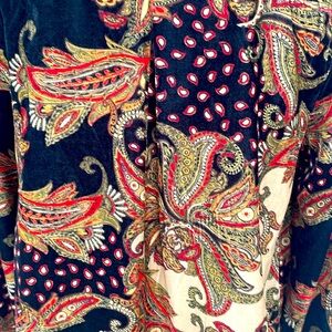 Soft Surroundings Women’s velvet multi Jewel tone colors of cream, avocado, green and red against a black background and it’s stunning. This long sleeve shirt has black velvet cuffs and a slight poof in the sleeve. Size medium boxy cut fits true to size. 25 inches in overall length and 19 1/2 inches pit to pit. Questions? Leave a comment below!