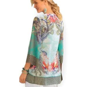 Soft Surroundings Muse Kimono. Semi sheer, paisley print, geometric print on sleeve and hem, sequins trim between paisley and geometric print. Dress up or down!