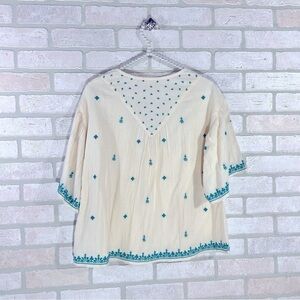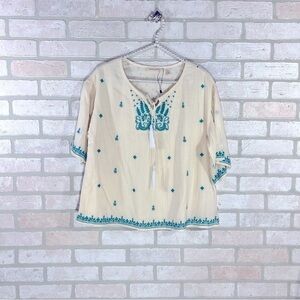Perfect gauzy flow with all over turquoise embroidery, split neck with tassel tie and elbow length flutter sleeves.