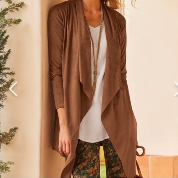 Soft Surroundings NWT Faux Suede Draped Light Jacket Large Saddle color 2X & Small. Super soft and light weight. Open front drape faux suede cardigan jacket Shacket. In new with tags zero flaws condition.