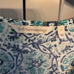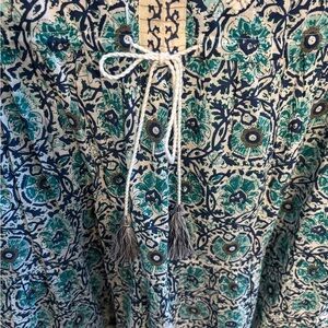 This printed dress has features you'll love. A versatile knee length for one. Then, a flattering V-neck. 3/4-length blouson sleeves, too. Finally, a tasseled drawstring waist to define your shape.