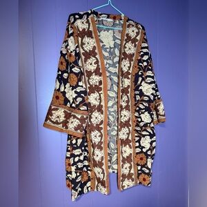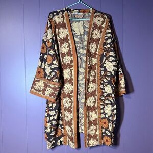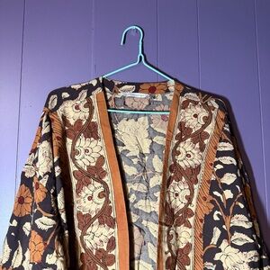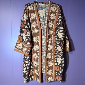 boho, bohemian, floral, kimono, soft surroundings, flowy, open front, rayon, layering piece, earth tones, lounge, cozy, vacation wear, resort, cottagecore, elegant, statement piece, casual chic, medium, artsy