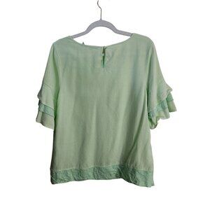 Soft Surroundings Oakleigh Margarita Green Tired Bell Sleeve Top Size M. Pit to pit 20", shoulder to hem 25", Tencel Cotton Mixed Media Fabric, Scoop Neck, Keyhole Back, Slit Sides, Ruffle Bell Short Sleeve, Retail $80. Good Pre-Owned Condition