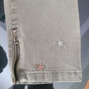 Don't miss out on these unique capri jeans which are in excellent condition - worn only once by me. Please see the photographs to appreciate the condition and all the details on these capri jeans. The unique details include zippers at the bottom side of each leg and inspirational copper-brown and dark silver stars embroidered onto the denim. The capris are olive green even though most of the pictures don't reflect that color - sorry about that. The waist width photograph best depicts the olive color. These capri jeans come from a smoke free home.
