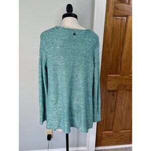 ever dream of being a mermaid? this is the sweater you would wear on solid ground. Seafoam green, with lots of little sequins, long in the front. in like new condition.