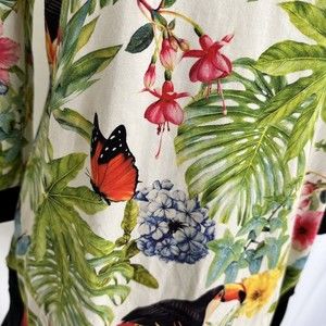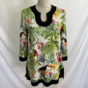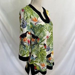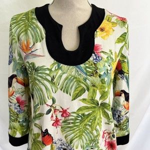Soft Surroundings Paradise Tunic Tropical leaves, birds, butterflies and flowers on this vibrant print tunic top with black trim Three-quarter sleeves Side-slit hem Size M Excellent preowned condition Underarm to Underarm 19 inches