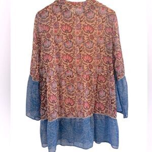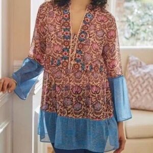 Soft Surroundings PERGOLA Blue Pink Floral Embroidered Sparkle Semi Sheer Boho Blouse