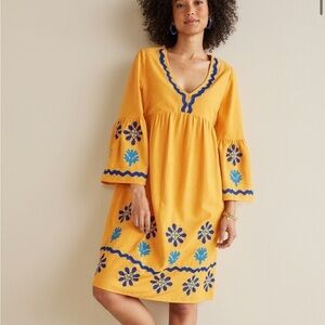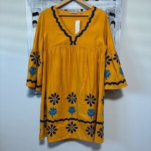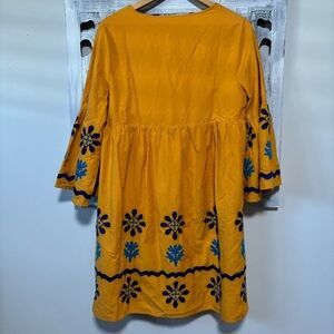 Soft Surroundings Petra Yellow/Blue Embroidered Bell Sleeve Short Dress NWT