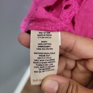 The Soft Surroundings Pink Embroidered Eyelet Sleeveless Top is a stylish and versatile addition to any woman's wardrobe. Made from 100% cotton, this top features a delicate floral pattern embroidered on a canvas fabric, with wide straps and a V-neckline. The pullover closure makes it easy to wear for various occasions, from casual outings to workwear and business settings. Its oversized fit and breathable material make it perfect for all seasons, especially summer, fall, and spring. This tunic-style top from Soft Surroundings is a flattering choice for women looking for a comfortable and chic option. This is in excellent preloved condition.