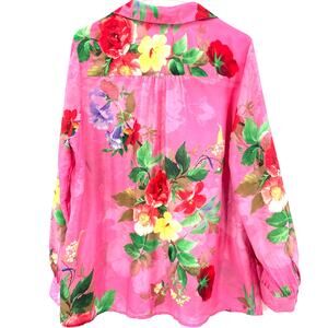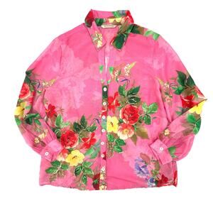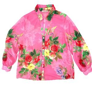 Vibrant pink blouse with floral design. Features red, yellow, and green accents. Button-down front. Long sleeves.