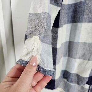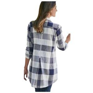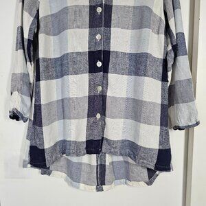 Tags: plaid shirt, soft surroundings, button-up blouse, casual top, back zip shirt, linen blend shirt, lightweight plaid, women’s shirt, relaxed fit, blue plaid top, soft plaid shirt, 3/4 sleeve top, high-low hemline