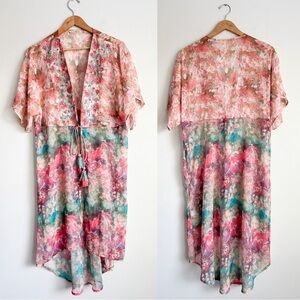 This sheer, midi-length topper has elbow length sleeves and a front tie with tassels.