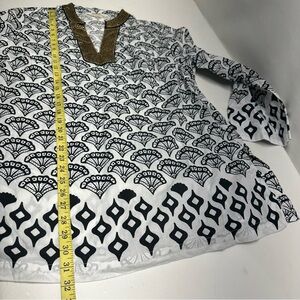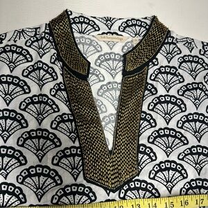 Stylish black and white tunic with geometric patterns. Features a comfortable fit and elegant design. Perfect for casual outings.