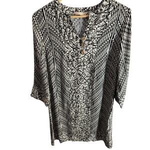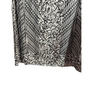 Embrace timeless style with this Soft Surroundings shift dress. The ecru and black raven color combination, along with the geometric pattern, create a striking and unique design. The knee-length dress features 3/4 sleeves and a v-neckline, making it perfect for any occasion, whether it be travel, a party, or casual wear. The dress is made of lightweight and stretchy rayon fabric, making it comfortable to wear during the summer, fall, or spring seasons.