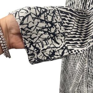 The Soft Surroundings Raven Shift Dress in size M is a stylish and comfortable option for casual occasions. Made from lightweight 100% rayon fabric, this knee-length dress features a V-neckline and pullover closure for easy wear. The black and white geometric print adds a boho beachy touch, while the wooden buttons and 3/4 bell sleeves add unique accents. Perfect for the summer, fall, and spring seasons, this dress is a versatile choice for various wardrobe styles.