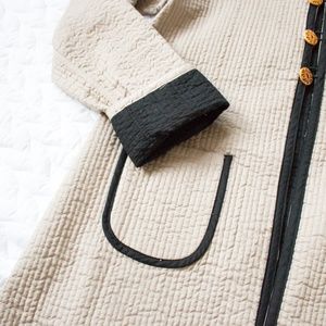 Features: Long sleeve reversible quilted-style long coat with 4 upper buttons. Two front pockets on either side. One side is black with tan/taupe piping. Other side is tan/taupe with black lining and piping. 100% cotton.