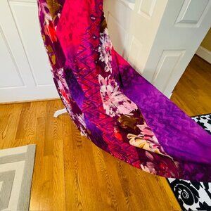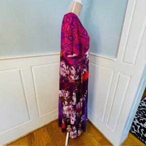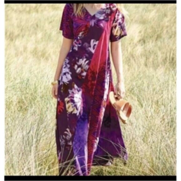 Soft Surroundings flowy A-line maxi dress in 100% viscose. Floral, tropical patchwork mixed print featuring bias stripes, V-neck and short sleeves. Chic casual or semi formal maxi dress, great for travel with minimal wrinkling. Comfortable and flattering dress, great vacation resortwear or cruise wear. Shades of purple, pink with splashes of neon.