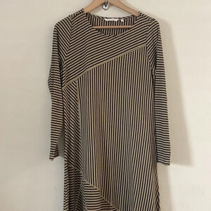 Hello slimming slanted stripes. This maxi of soft ribbed knit is cut with diagonal seaming and multi-directional stripes for a casual, confident look.
