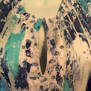 Stunning Sheer Sift Surrounding 100% Silk 3/4 Balloon Sleeve Water Color Blue Tunic/Swim Cover With Beaded Split Neckline. Sz.3X (24W) VGC. Gently pre-worn. One tiny stain on bodice.. see last pic