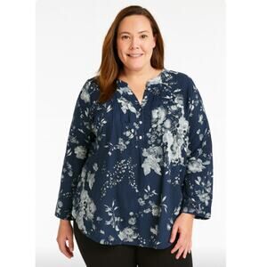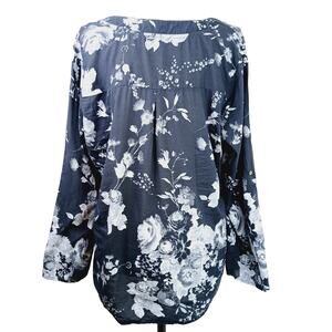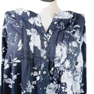 Soft Surroundings SZ 1X 100% Cotton Gray Floral 1/2 Button Front Tab Sleeve Top