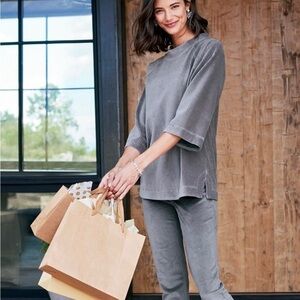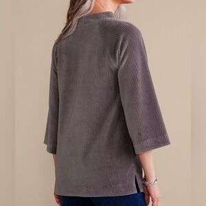 Brand new with tags Soft Surroundings Samina Corduroy Pullover sweatshirt in a dark Shoreline Grey. Size medium. Wide mock neck. 3/4 sleeves. Side slits. Retailed for $89. NWT.