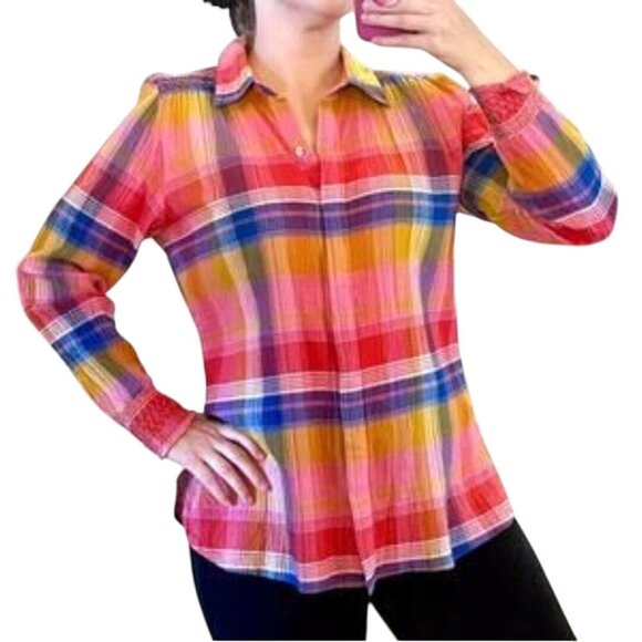 Soft Surroundings Sansonne Plaid Embroidered Button Front Shirt Size L