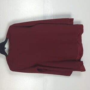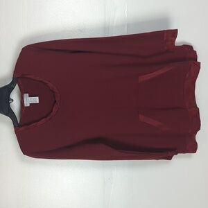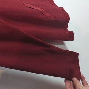 Red. Satin trim along the neckline, sleeve cuffs, hemline, and pocket. Kangaroo pocket. Long sleeves. Excellent condition -- no stains, rips, or fraying. Perfect for the holidays! Laid flat pit-to-pit: 19in. Shoulder to hem: 29in