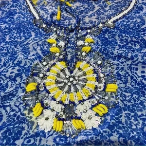 Note- please refer to pictures for measurements as the item is preowned. Allow for slight color variations due to lighting. All beading appears in tact. There is a pulled thread on one sleeve that goes all the way around, as well as a small spot- may be able to be spot cleaned. Due to the sheer material both flaws are difficult to see from a distance