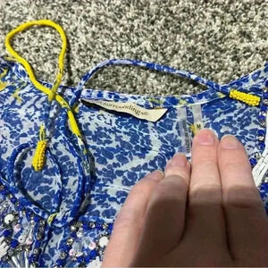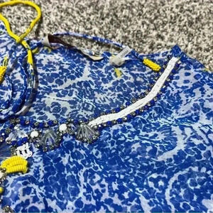 This Soft Surroundings cover up is perfect for any beach or pool day. The blue polyester material is lightweight and sheer, making it ideal for summer sun. The beaded and embroidered accents add a touch of elegance to this M-sized cover up.