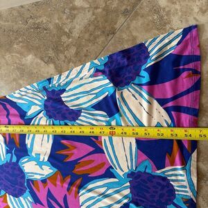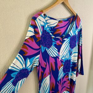 Very good preowned condition. No flaws, stains or holes. Stretch jersey fabric with a bold and colorful floral botanical print. Colors of pink, white and blue. Scoop neck and 3/4 length sleeves. Long maxi length with two side slits at bottom hem. See all photos for details and measurements.