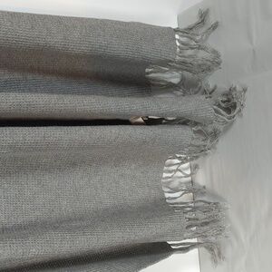 Gray. Sweater knit material. Tassel fringe on each end. Excellent condition -- no stains, holes, or fraying. Width: 29in. Length: 88in (not including tassels).