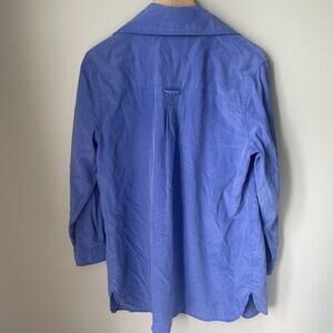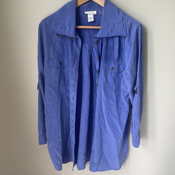 Add a touch of classic and bohemian style to your wardrobe with this beautiful blue button-up tunic shirt from Soft Surroundings. Made from a luxurious silk blend, this shirt features a collared neckline, long sleeves with roll tab details, and a buckle accent. The shirt is perfect for any occasion, whether you're dressing up for a night out or keeping it casual for a day at the office.