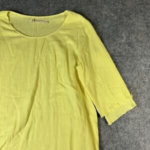 Drape yourself in the effortless elegance of the Soft Surroundings Siesta Key Tunic Top. This medium-sized top showcases a vibrant yellow hue that brightens any casual or travel wardrobe. Made from breathable cotton gauze, it's a piece that promises both comfort and style, especially designed for the warmer seasons of summer, spring, and fall. The tunic's design features a flattering round neckline and casual 3/4 sleeves, making it a versatile addition for layering or as a standalone piece. Its lightweight fabric ensures ease of movement, while the pullover closure allows for hassle-free wear. Simply hand wash and care for this blouse to maintain its lovely appearance.
