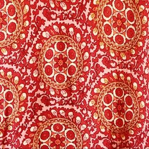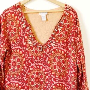 Soft Surroundings long sleeve tunic in shades of red and orange with a bold floral mandala knit top. Rounded v-neck with jewels along the neckline. 34% Silk, 26% Nylon.