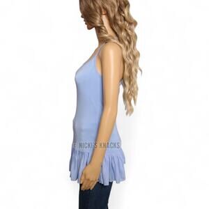 Style tags: Soft Surroundings, silk hem tank, casual layering top, blue tunic, petite summer top, stretchy knit tank, feminine boho look, soft rayon blend, light blue cami, romantic casual style