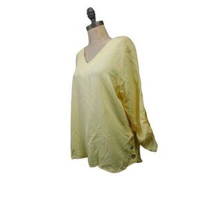 This Soft Surroundings Size M V-neck blouse offers a chic, versatile style. The tab button sleeves add a fashionable twist to this everyday essential. Perfect for work or casual wear. Vneckline, tab button sleeves to wear long or 3/4, back is longer than front and button accents on sides