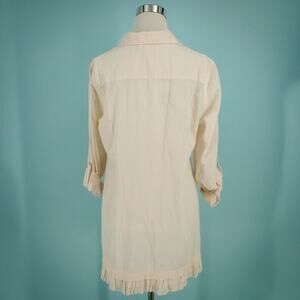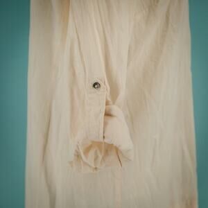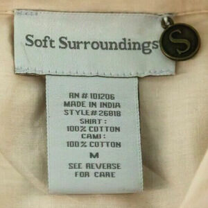 Soft Surroundings Size Medium M Light Pale Pink Collared Button Front Down Long Tab Roll Sleeve Pleated Trim Detail 100% Cotton Tunic Top Blouse Shirt- Style 26818
