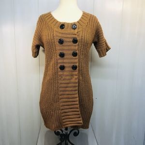 Get cozy and stylish this season with this Soft Surroundings size small City sweater. Crafted from a luxurious wool blend, this tunic style sweater features a crew neckline, short sleeves, and a double row of buttons. The knit fabric is solid brown color with black buttons. One of the buttons has some surface scratches, as seen in a photo, that could be touched up with a marker. It is hand wash only.