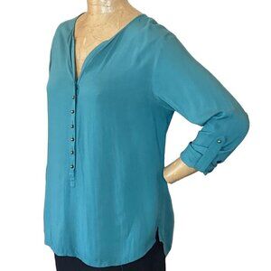 Soft Surroundings Split Neck Button Tunic Blouse Roll Tab Sleeve Sz S Teal 285M