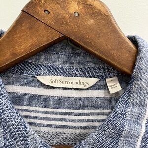 Soft Surroundings Laganlook Button Down Top Shirt Linen Cotton Blend stripe Blue Large in excellent condition,no flaws. I love the cut of this shirt,comfortable and easy to wear. Please refer to photos for measurements and details