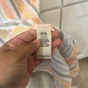 Soft Surroundings dress with pastel stripes. Features peach, blue, and cream colors.