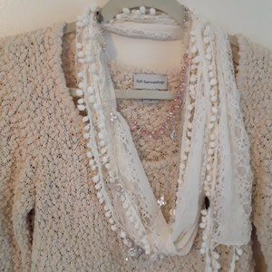 Stunning beige full length sweater by Soft Surroundings WORN ONCE! Like new condition. It's a size extra small but does have quite a bit of room. Not true to size, as a medium could also wear it. Features a scoop neckline with a popcorn knit texture with fringe around the bottom. 3/4 sleeves. Perfect dressed up or great with leggings. Laying flat, from under arm to under arm it measures 20 (stretch to the fabric). Length is 24." to the tip of fringe. From a pet & smoke free home.