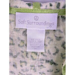 This cardigan sweater by Soft Surroundings features a stylish leopard print design. Crafted for comfort and elegance, it is made from high-quality materials, offering an appealing look and cozy feel. The cardigan is suitable for various settings, providing a versatile addition to any wardrobe.
