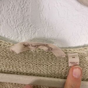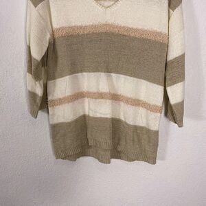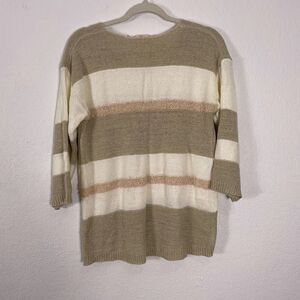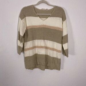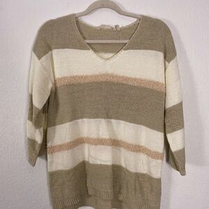 Great pre-owned condition Soft Surroundings cream with tan & Light Brown Striped V Neck Pullover 3/4 Length Sleeve Sweater