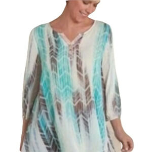 Soft Surroundings Tayanna Aqua Brushstroke Semi-Sheer Chiffon Abstract Sheer Tunic Top, size Large, 3/4 Sleeves with elastic at ends, 100% rayon. Zigzag chevron pattern. Slight shark bite hem.