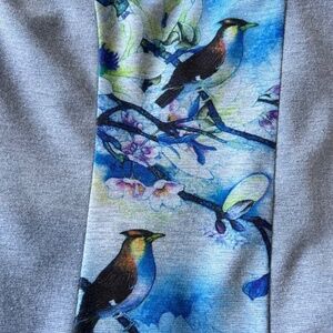 * Features: double layered fabrics - exterior has soft stretch fabrics alternating solid and floral, bird patter and interior lining is a cool, lightweight koi fish and water lily print. Front collar waterfalls into hem point. This is a beautiful piece that will elevate any basics.