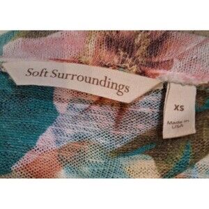 The Soft Surroundings Teal Floral Long Tunic Top Sweater in size XS is a stylish and versatile piece perfect for various occasions. This oversized top features a flattering V-neckline and long sleeves, making it suitable for travel, casual outings, workwear, and business settings. The beautiful floral pattern in shades of pink adds a touch of elegance to the relaxed fit garment. Made from a blend of polyester and rayon, this knit top requires hand wash care and is ideal for the seasons of summer, fall, and spring. Overall, this top embodies a classic and floral theme.Size XS - measures 18" pit to pit. A shaped tunic length lightweight top.
