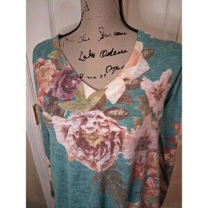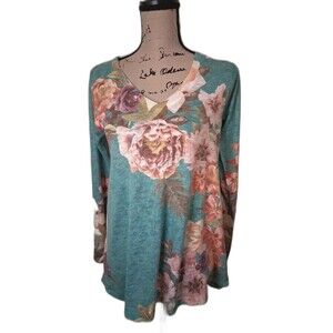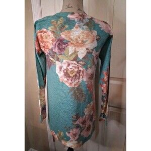 Soft Surroundings Teal Floral Long Tunic Top Sweater V-Neck Size XS Oversized