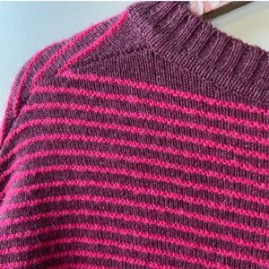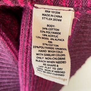 Textural swirls and ribbed stripes in a jacquard wool-alpaca blend in on a cotton-wool blend V-neck pullover, with ribbing at the neck and hem, and dropped shoulders. Pink with maroon/purple stripes.